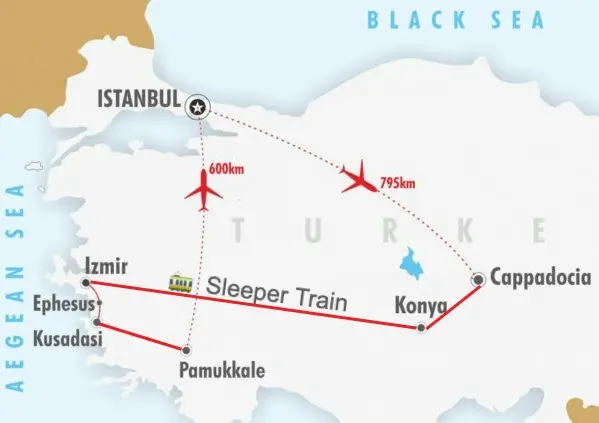 A: The Discovery of Turkey 8 Days tour is a guided tour featuring a direct flight from Istanbul to Cappadocia and a nostalgic sleeper train journey from Konya to Selcuk.