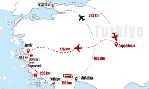 A: The itinerary varies depending on the tour operator, but typically includes a visit to Istanbul's historic sites such as the Grand Bazaar and the Blue Mosque, visit to the underground city in Cappadocia, and Ephesus and a visit to the travertine terraces of Pamukkale.