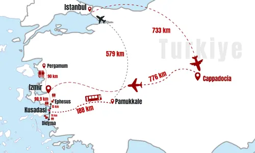 Discover Turkey’s most enchanting landscapes and ancient wonders with this all-inclusive package. Explore the surreal rock formations of Cappadocia, walk through the historic ruins of Ephesus, and marvel at the stunning white terraces of Pamukkale. Dive deeper into history with visits to the remarkable sites of Pergamum, Priene, Didyma, and Miletus, where ancient temples and theaters bring Turkey's past to life.